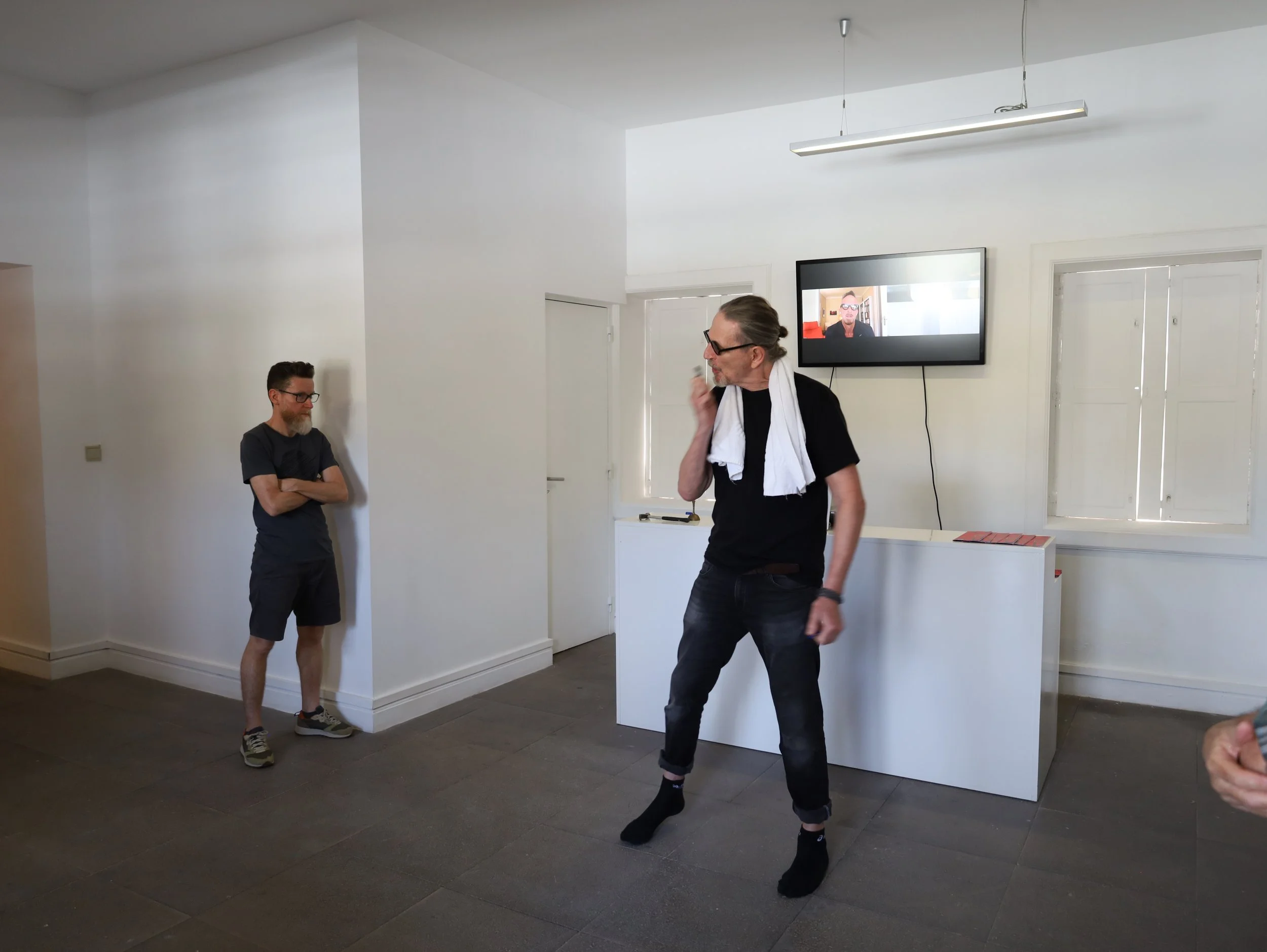 After four years of developments and preparations, our exhibition «Round 1.1: A Hairy Decalogue» opened the evening of May 30 at the Mudas Museum of Contemporary Art in Madeira, Portugal. The show, a collaboration between the Barcelona-based art collective Adversorecto (Peter Freund and Werner Thöni) and Portuguese artist and professor Vítor Magalhães, runs May 30 - Oct 25, 2025. The opening intervention, «The Right Hand Doesn’t Know What the Left Hand Is Doing», a live performance art presentation featuring the trio, was launched during the May 30 opening.