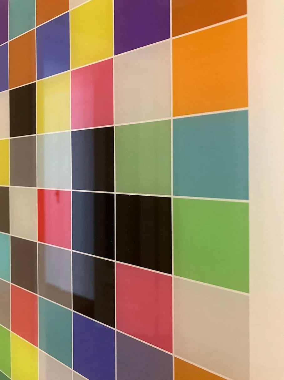 After the grid squares are organized as a digital book, using the phi ratio for design, these books are then converted into video loops that shuffle through the variegated pages.