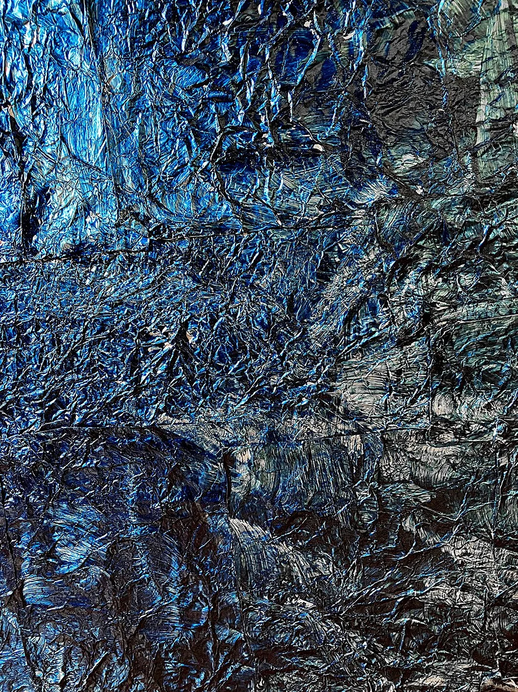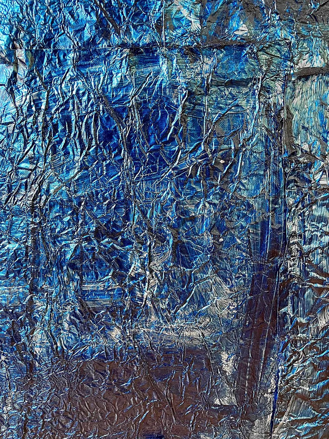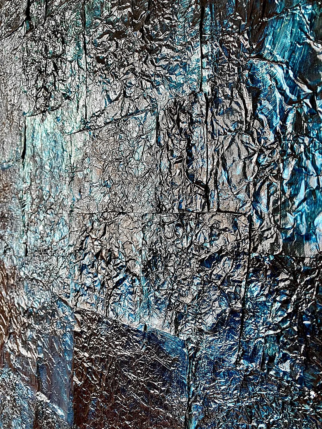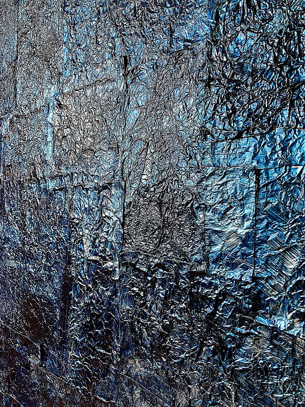 Text buried beneath a series of nine paintings, followed by tin foil, then by paint, then by varnishes.